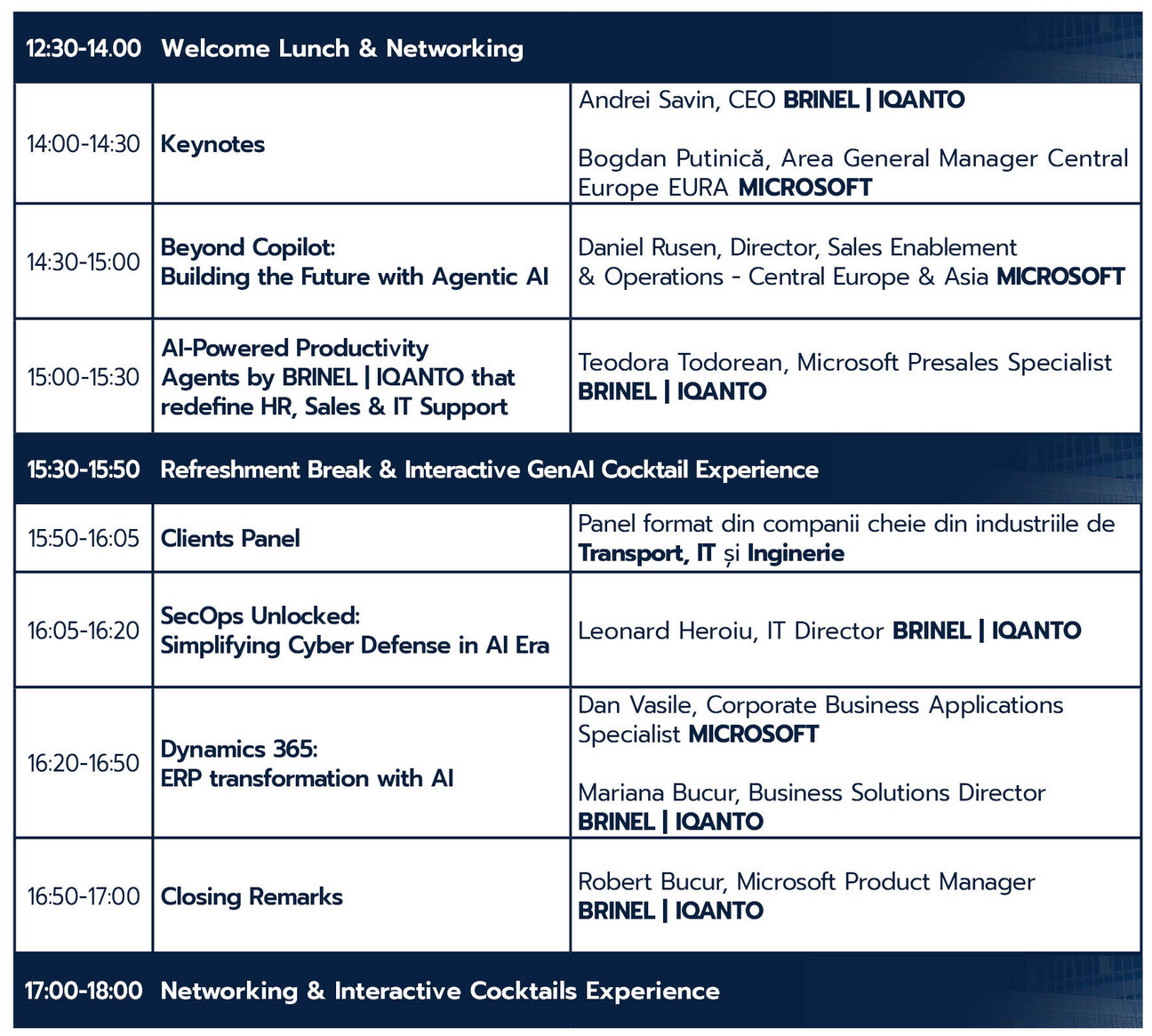 BRINEL | IQANTO & Microsoft vă invită la un eveniment exclusiv dedicat explorării modului în care puteți integra inteligența artificială în procesele de afaceri și asigura un nivel avansat de securitate cibernetică pentru datele, sistemele și utilizatorii companiei, într-un mediu dominat de AI.